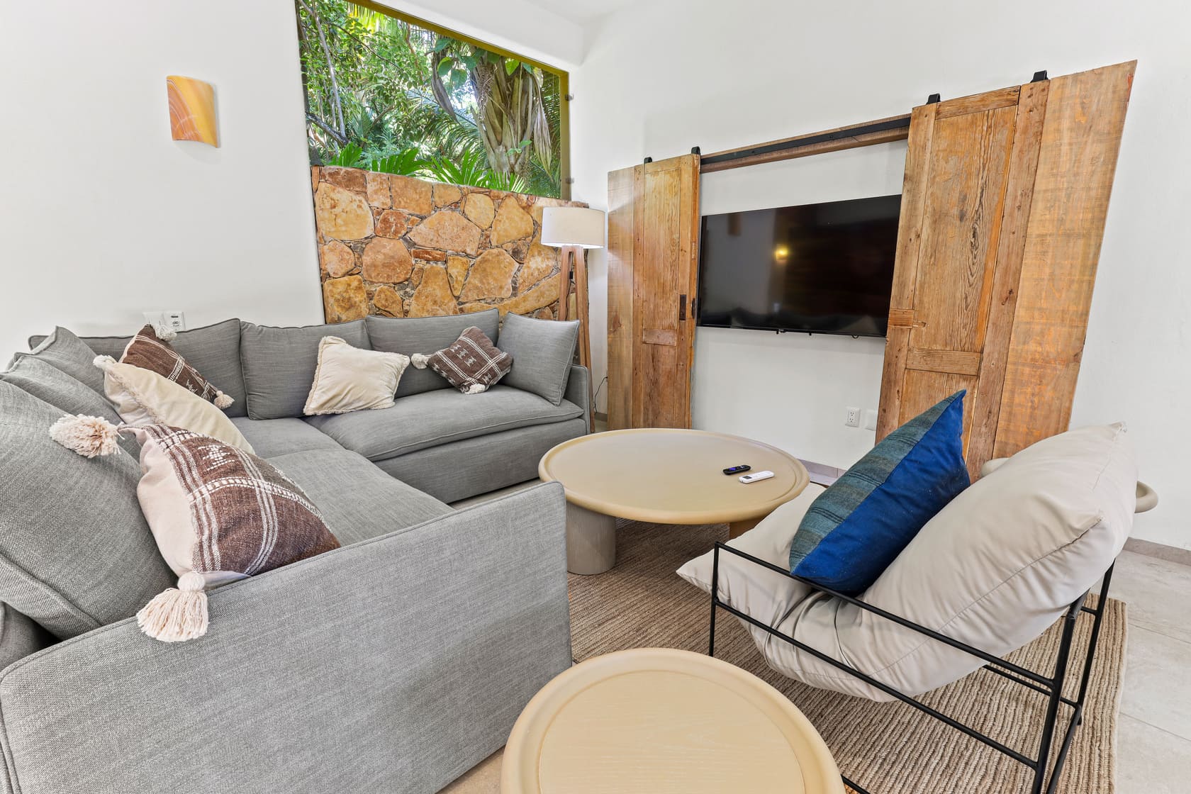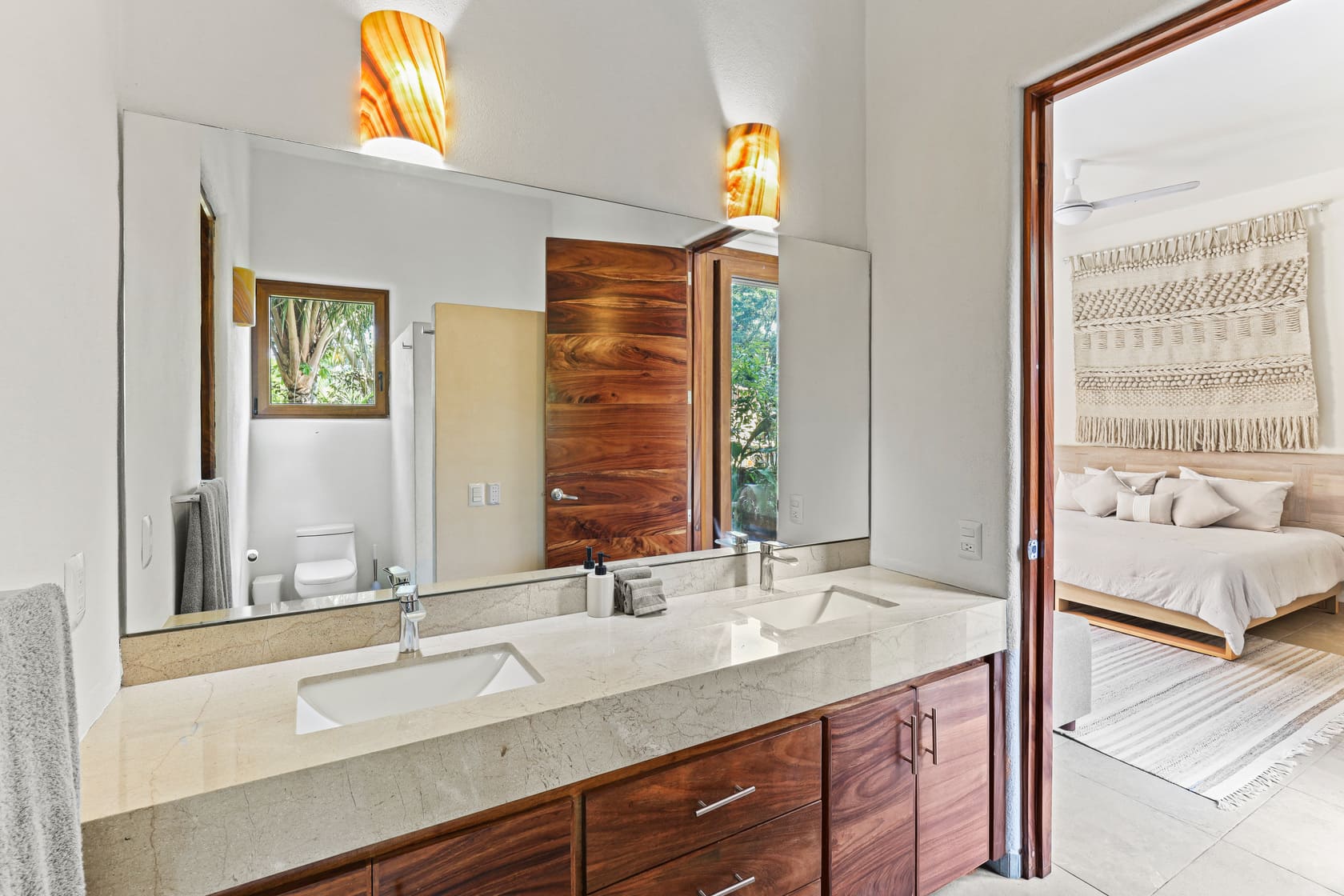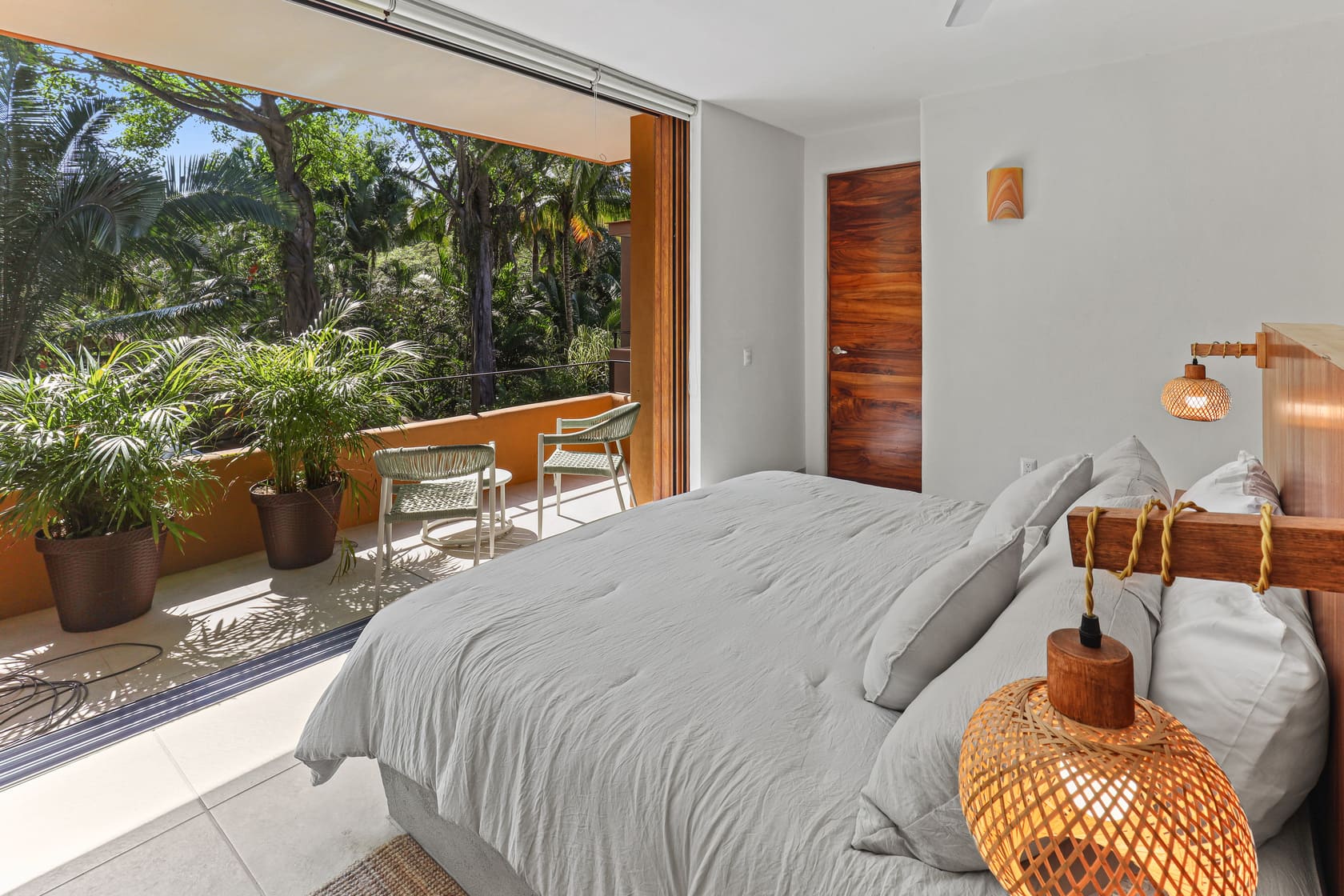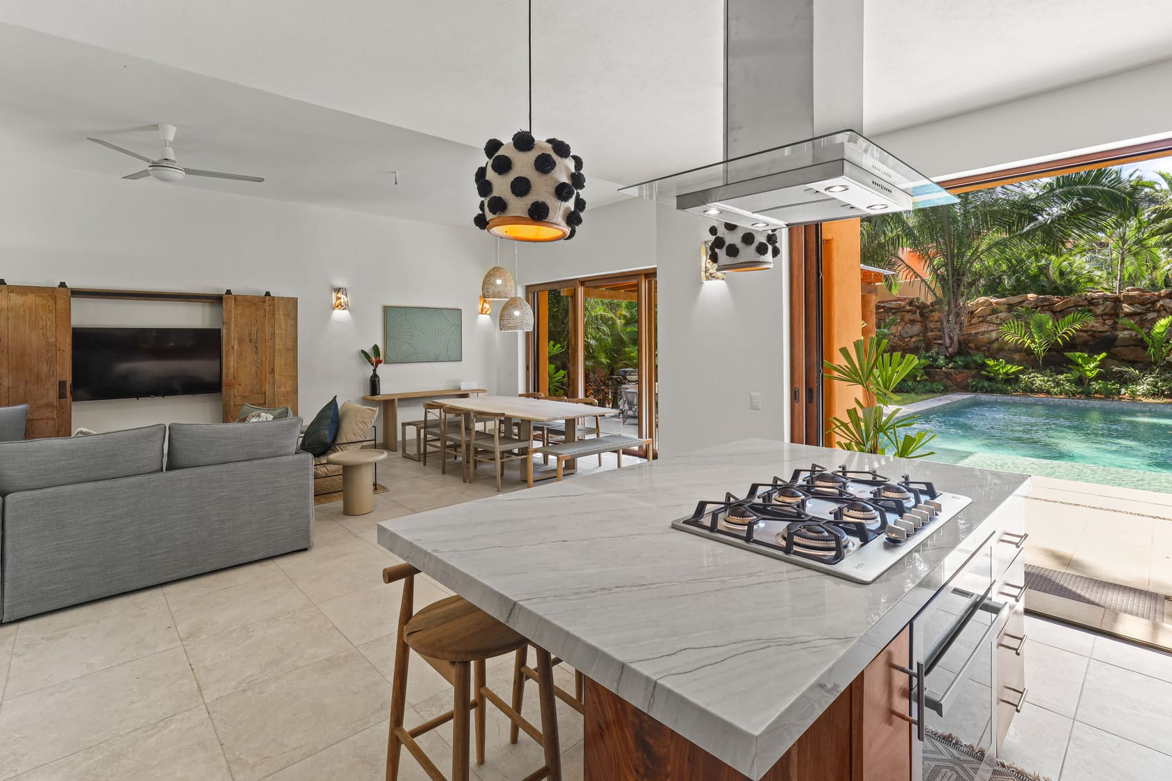 Each of the five bedrooms is designed for optimal relaxation, featuring AC, powerful fans, blackout shades, cross-ventilation, and professionally curated decor with local art and photography. One of the bedrooms even has direct access to the pool, perfect for morning swims
